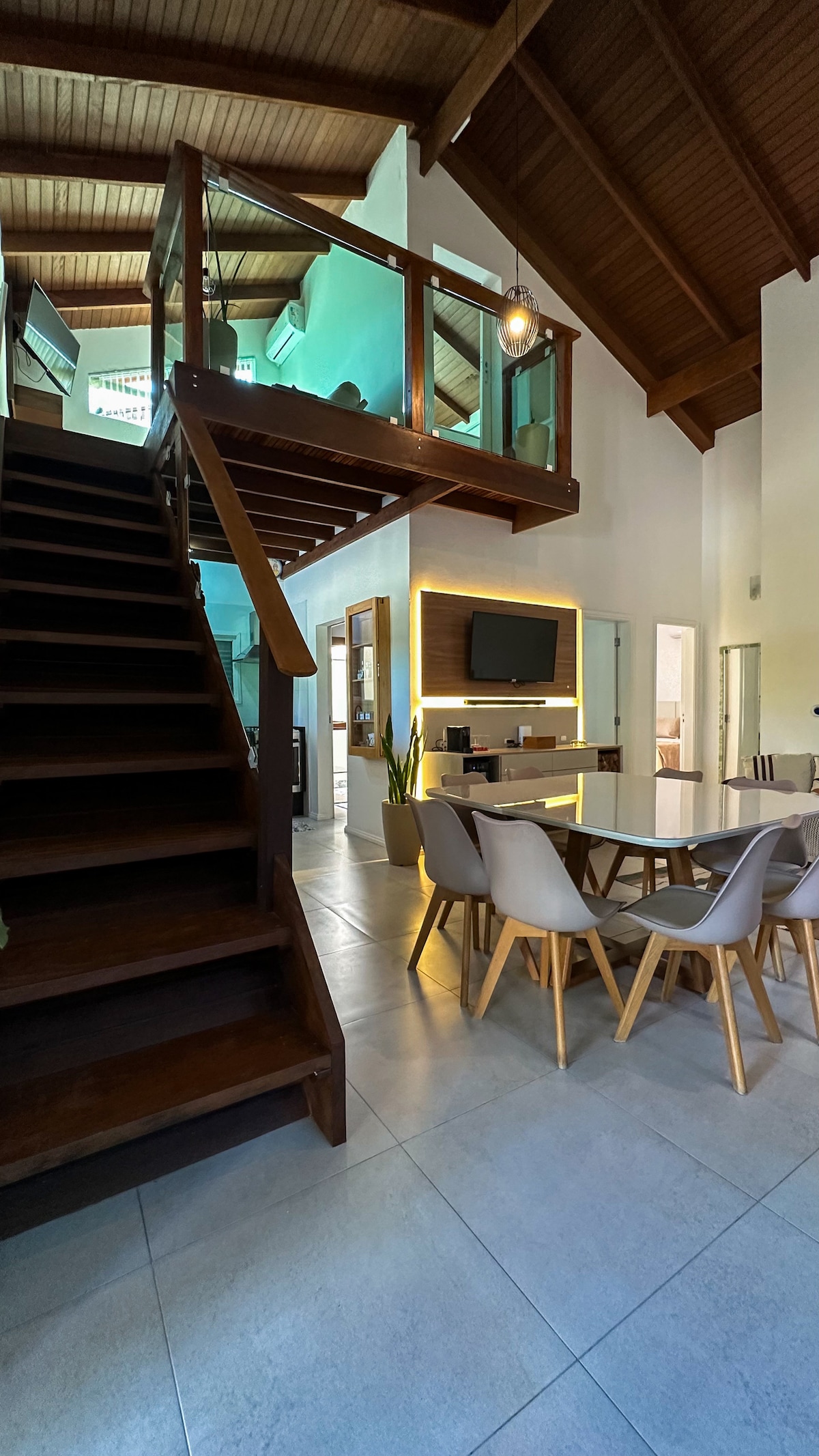 Super nice house, bright and well ventilated. Loft style, with a rustic look and a private room. Compost bin, some vegetables and a very large patio. Close to the tranquility of Acaraí Park and 800 meters from Praia Grande and its waves. It's a 10-minute walk. Deck with barbecue and large open garage. Close to Prainha, local bars and restaurants. Also close to the Acaraí River and the new beach boardwalk.