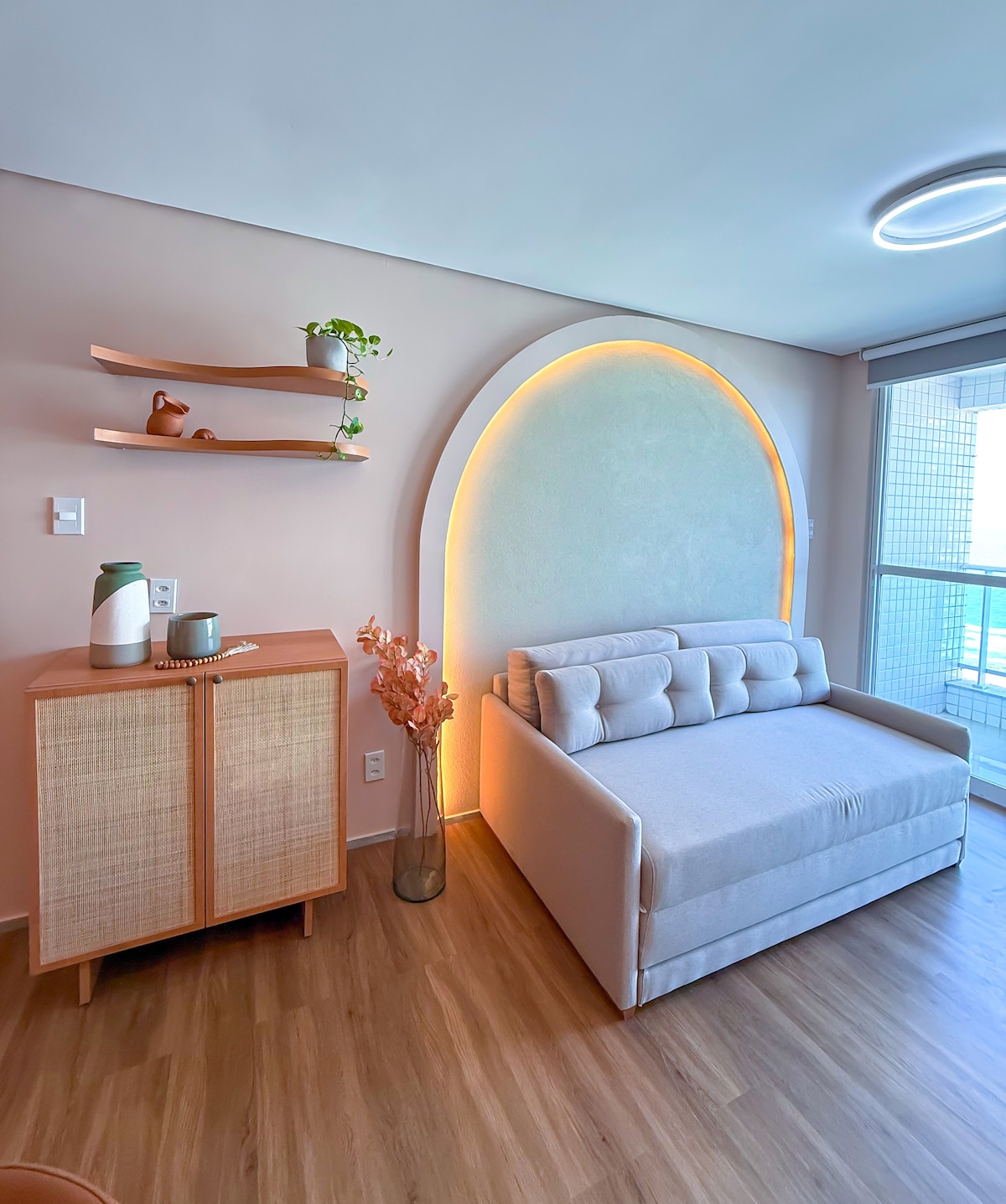 Um espaço contemporâneo, inspirado em mobiliário curvo e tons naturais, criado para proporcionar bem-estar, leveza e aconchego. O apartamento foi pensado em cada detalhe: iluminação indireta no arco central, marcenaria sob medida, texturas naturais, decoração em cerâmica e paleta em tons amadeirados e terrosos que trazem uma atmosfera calma e sofisticada. Ideal para quem busca uma estadia inspiradora, seja para trabalhar, descansar ou viver a cidade com charme e conforto.