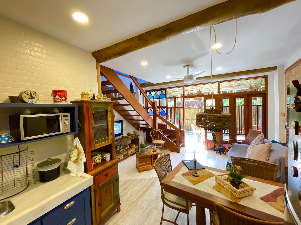 Chalé charmoso em frente ao mar com sala conjugada com cozinha e sofá cama, um quarto, uma varanda ampla, um banheiro completo, jardim com chuveirão e muitas árvores, wifi de alta velocidade. Acesso à casa caminhando (10 min) desde o estacionamento de carros (Rua Maria Caetana). Ajuda para transporte das bagagens.