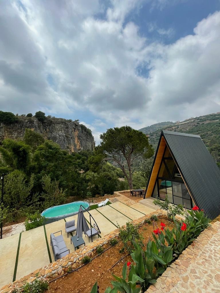 Kick back and relax in this A-shaped, stylish wooden cabin with spacious outdoor space and a private Jacuzzi . Hosted by Riverside Jahliye, located only 35 minutes away from Beirut. Have a walk by the tranquil river right next to your cabin and experience the ultimate mountain retreat. The cabin boasts a cozy interior with warm wood finishes, providing a welcoming atmosphere for relaxation after a day of exploring the scenic surroundings. Enjoy the mountain view from the comfort of your balcony.