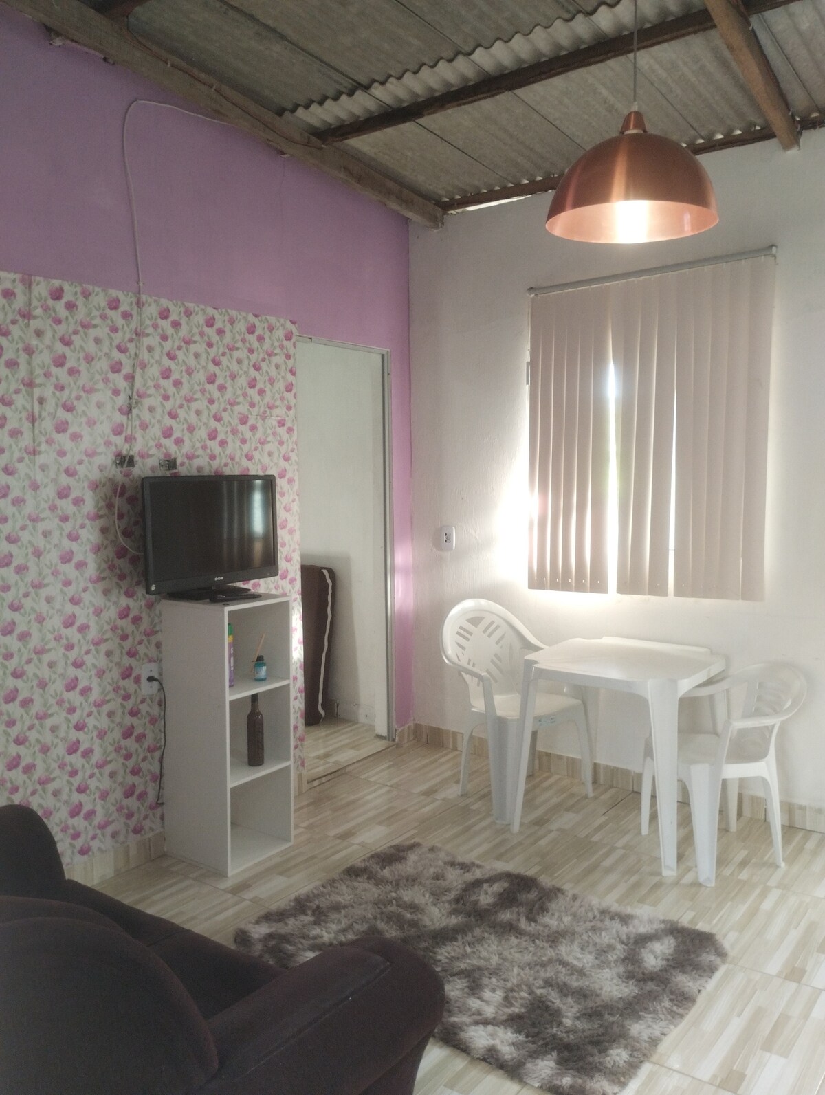 Relaxe com toda a família nesta acomodação tranquila, aconchegante e familiar, disponibilizamos 1 quarto com uma cama de casal, ar condicionado, sala com tv, wi-fi, cobertura com redes, área com churrasqueira, chuveiro externo