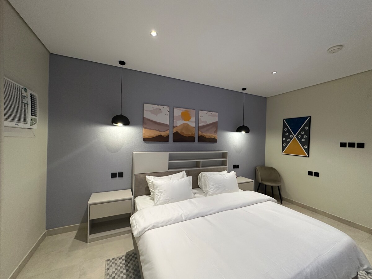 مرحبا بكم في شقتنا التي توفر لكم إقامة استثنائية تفوق توقعاتكم.الشقة تحتوي على غرفة نوم مجهزة بأجود أنواع المراتب بالإضافة الى صالة منفصلة بأرائك مريحة مع شاشة ذكية 65 بوصة للاستمتاع(نتفلكس, شاهد, بي ان)+واي فاي. المطبخ مجهز بكامل الأدوات لتلبية جميع احتياجاتك. تتوفر جلسة خارجية بتصميم ريفي واطلالة مميزة على المركز المالي مناسبة لإقامة المناسبات والجمعات مع الاهل والاصدقاء. الشقة مُجهزة للإقامات القصيرة والطويلة. الموقع رائع في قلب المدينة بالقرب من المعالم السياحية والخدمية والمطاعم.