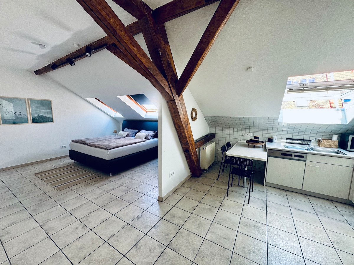 Das Apartment befindet sich in der 4 Etage eines Altbaus aus dem Jahr 1909 mit Blick auf die Dächer der Schweinfurter Altstadt. In dieser 40m² großen Dachwohnung mit ausgebautem Giebel und freiem Ausblick fühlt man sich sofort wie Zuhause. Es verfügt über alles was es für einen längeren Aufenthalt oder für Wohnen auf Zeit nötig ist. Es verfügt über ein Bad mit Dusche und eine brandneue voll ausgestattete, offene Küche mit Kühlschrank, Kaffeemaschine, Toaster, Wasserkocher, Herd und Geschirr.