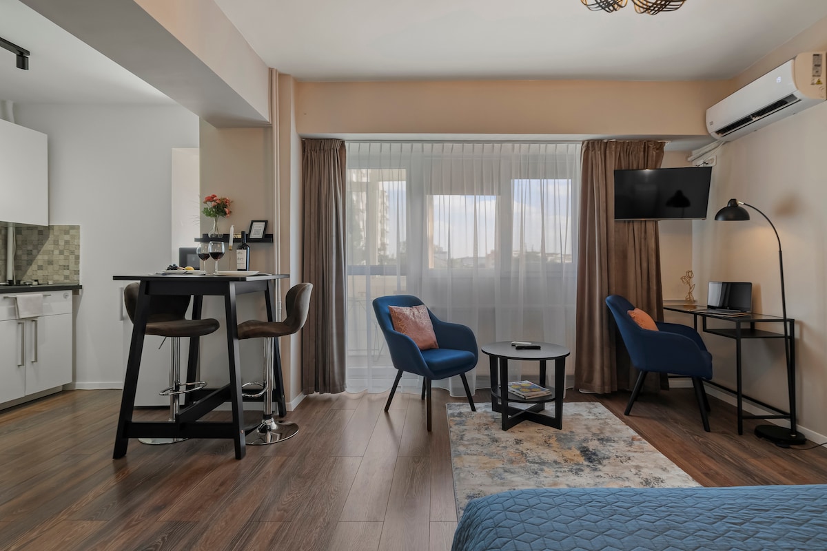 Experience luxury in our 1BD 1Bath apartment nestled in Bucharest's upscale Herastrau neighborhood. Revel in contemporary decor and premium amenities, like a well-equipped kitchen, high-speed Wi-Fi, and comfortable queen-beds Explore the city effortlessly with accessible public transportation and complimentary underground parking. ā Private Underground Parking ā High-Speed Wi-Fi ā Smart TV with Netflix ā Nespresso Coffee ā Stunning City Skyline View ā Private Terrace