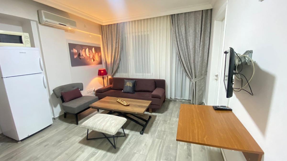 The city center and Sığacık are 5 minutes away by car. A quiet and peaceful fully furnished detached house with a parking lot and garden. Relax with the whole family at this peaceful place to stay. The house has an 81" TV, a work desk, two air conditioners, one in the room and one in the bedroom, and a barbecue in the garden. Not suitable for those without a private vehicle.