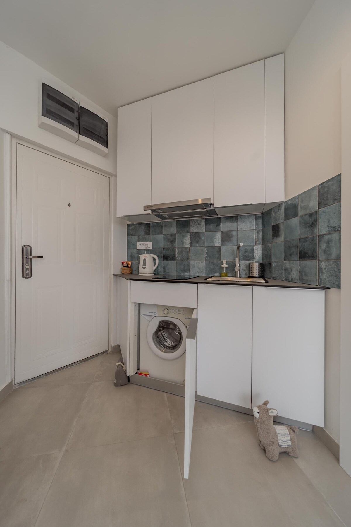 The apartment is full renovated a few months ago and everything is brand new. In the bedroom there is a large comfortable double bed and one big sofa bed in the living room. All in discreet led light. In the kitchen you can enjoy a modern flat-screen cooker, oven, refrigerator with freezer, dishwasher and washing machine and a large bar table. The bathroom is glazed with marble ceramics, it is very compact and clean. The bathroom is equipped with a hairdryer, towels, hygiene sets.