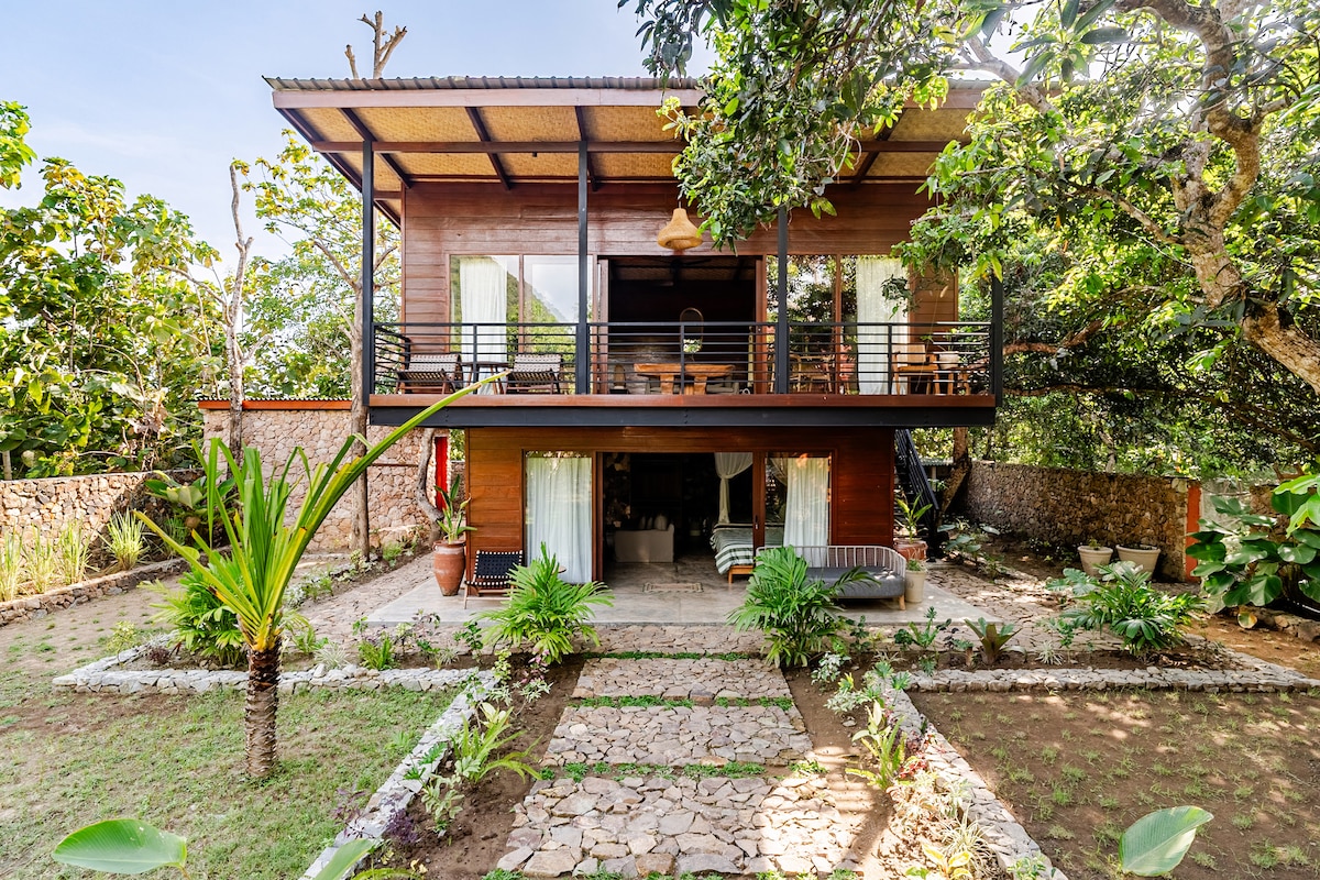 Tucked beneath the shade of mango trees in West Sumbawa, this two bedroom sanctuary is where serious surfers come to rest well and live beautifully between sessions. The house is built with soul — hand-laid stonework, rich hardwood timber, polished concrete and timber floors, and outdoor showers that make rinsing off after a surf feel like a ritual. Wake up, step out onto the deck, and let the mountain views do the rest.