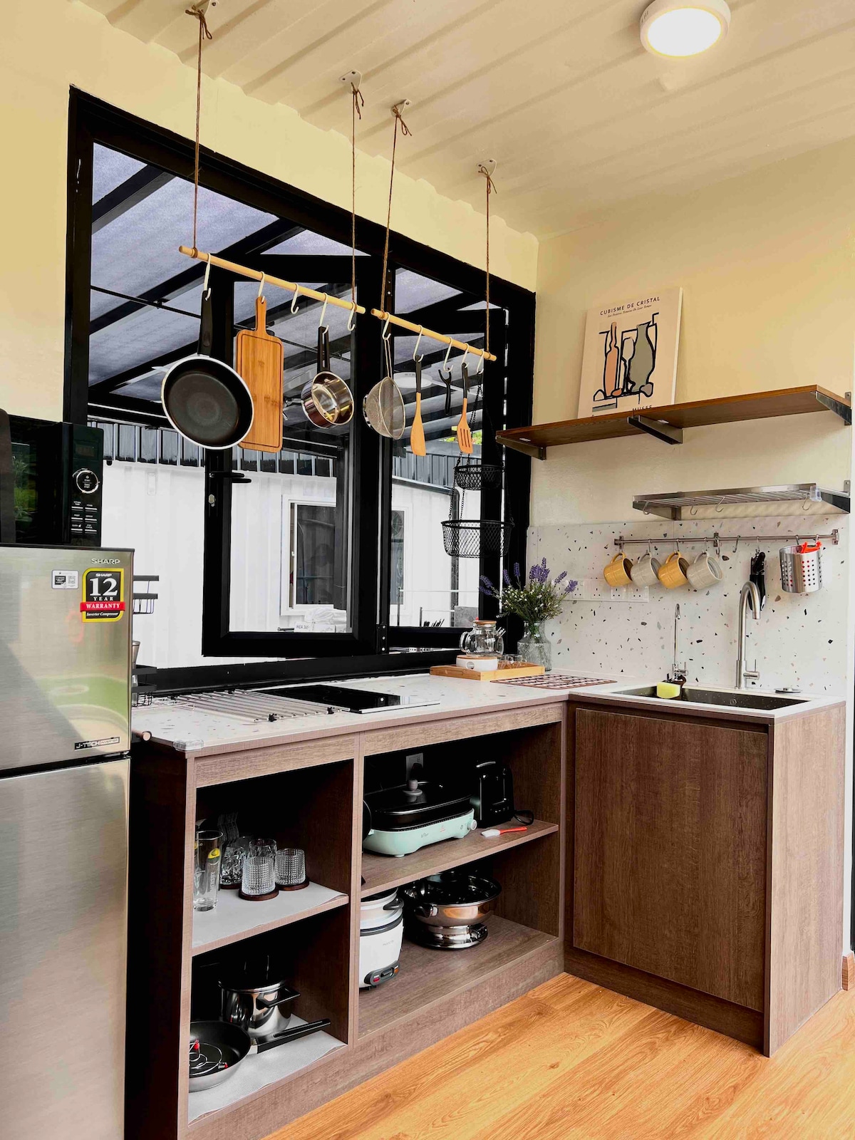 8 nos. of 40 foot shipping containers repurposed & stacked to form a 5-bedroom retreat with entertainment deck & kitchen facing a golf course & fish pond. There is access to a deck facing the majestic Bukit Takun & golf course, also a shared swimming pool, hammock, sauna, trampoline. Surround yourself with nature only a mere 30 mins drive away from the centre of KL.