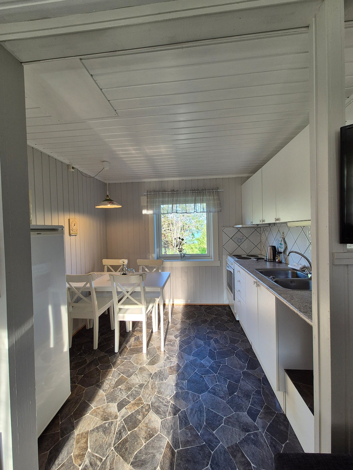 Bright and modern cabin. Newly built in 2018. Spotlights in the ceiling, fridge, dishwasher, stove and hotplates. Dining table with room for 6 people. Cable TV and sofa. Tiled bathroom with rainfall shower. 2 bedrooms with double bed plus loft with space for 2-3 people. View of mountains and the ocean. Terrace with outdoor furniture and barbecue.