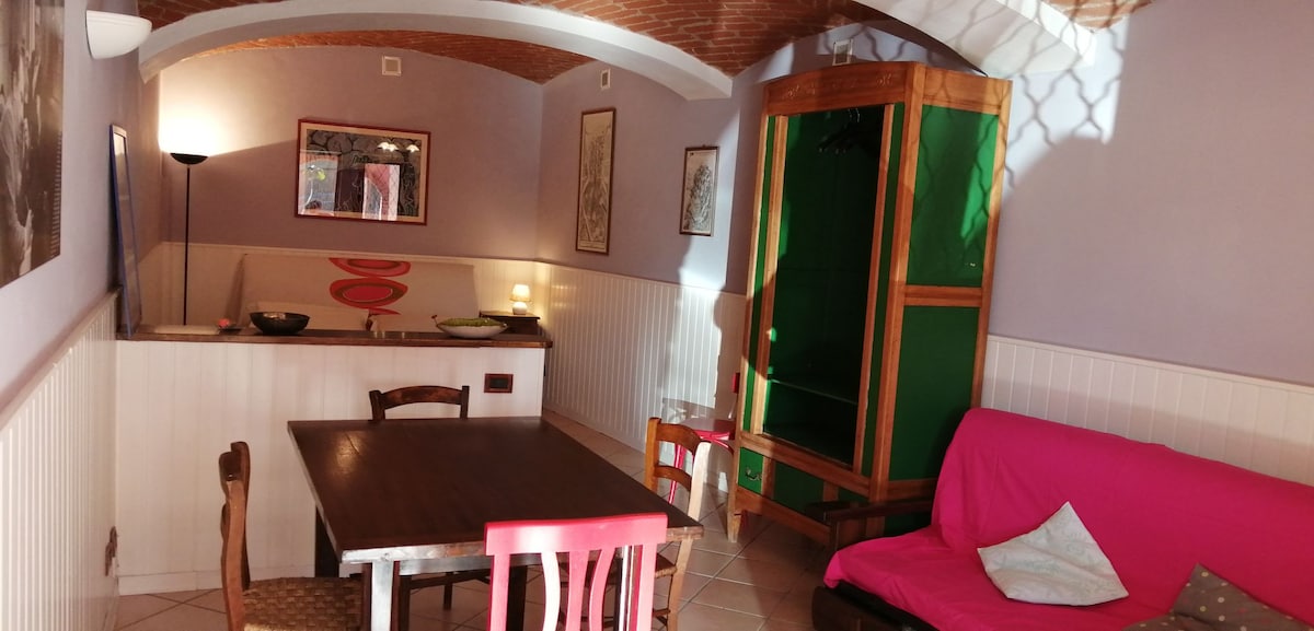 In the historic center of the city of Giaveno in the pedestrian area. Small house on the first floor with self check-in. Very bright, with window and balcony. Bed 140x200cm and armchair bed 80x190cm. Kitchen with stove top, microwave oven, refrigerator/freezer; equipped and ready for daily use. Bathroom with shower, washing machine and clothesline. Thermoautonomous. TV and dedicated WiFi On request, bed and baby high chair. Pets allowed only by prior to booking. CIR 00111500010