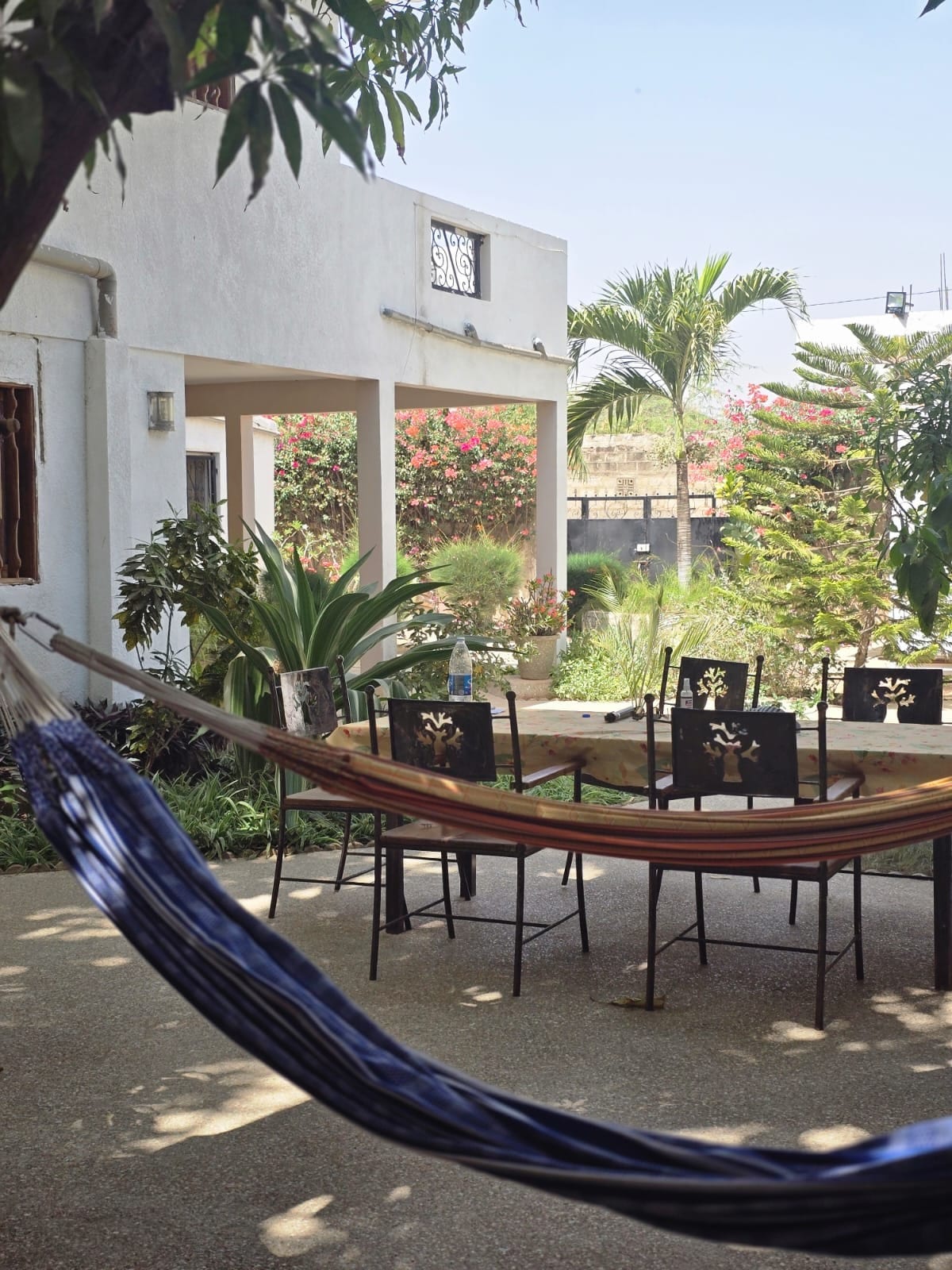 The road and the bush end at Ndangane! The mangrove then opens onto the Siné Saloum Natural Park. Canoes and carriages for excursions, fishing trips, swimming… After breakfast on request 2000 cfa/pe. The village and its typical shops, restaurants in a peaceful atmosphere. The house is 5 minutes from the city center, the beach nearby, quiet. The garden planted with mango trees preserves a welcome freshness. Table, chairs, hammocks, the relaxation area is yours.