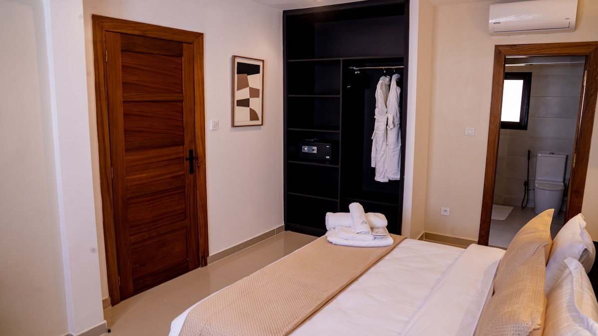 Experience Dakar in our seafront property. It is spacious and it offers free daily cleaning, AC in every room, and a 24/7 concierge for a seamless stay. This room is connected to a spacious private living room. Breakfast is available on demand Enjoy added convenience with optional services like tourist guides, and airport shuttles tailored to your needs.