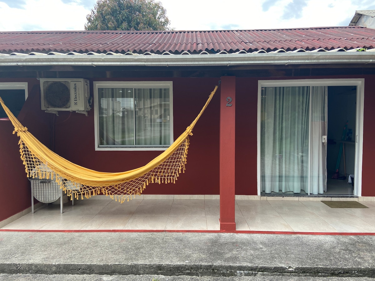 Enjoy this Chalet located in the center of Bombinhas. It has a panoramic view of Bombas Beach. The property has 2 floors and is located at the end of a quiet street surrounded by nature. The property has: - Bedroom with air-conditioning. - Queen-size bed. - Bed and bath linens included. - Local TV in the bedroom. - Wi-Fi. - Full kitchen with utensils. - Shared BBQ grill next door. - Shared washing machine outside the chalet. - Outdoor parking for 1 car.