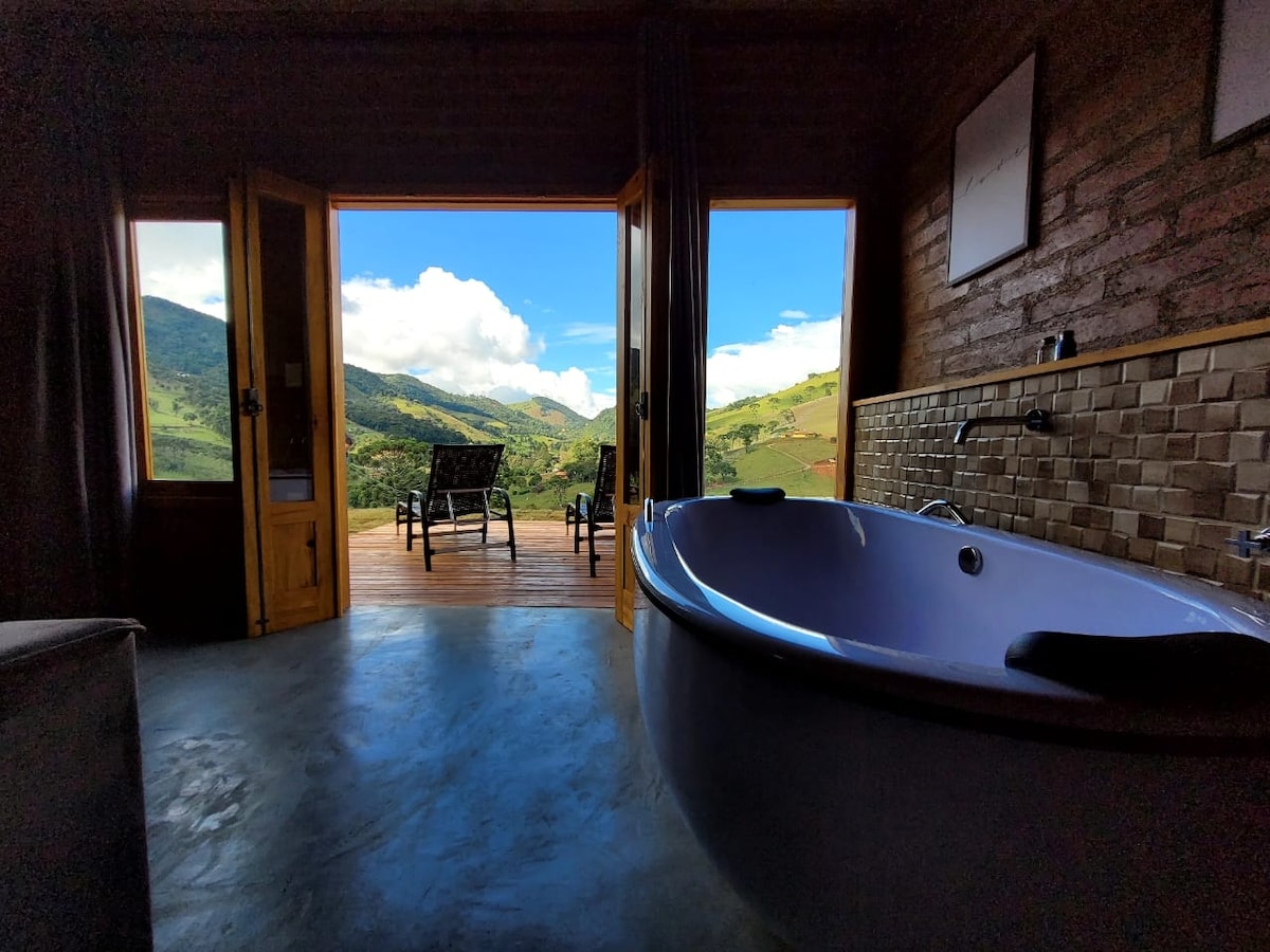 The exuberant Alto da Pedra Branca chalet is literally located in the heights, at an altitude of 1,400 meters in the middle of the Serra da Mantiqueira mountains. Located in Paraisópolis, South of Minas Gerais, between the cities of São Bento do Sapucaí and Gonçalves. It's the perfect place for couples looking to experience amazing days in the mountains. For this, we offer a bathtub with a panoramic view in a quiet place with privacy. Enjoy an unforgettable sunrise and starry sky!