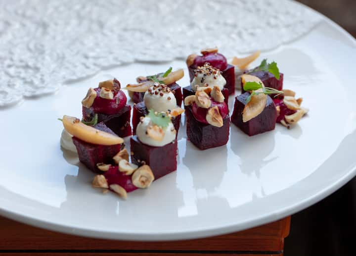 An elevated tasting menu beginning with a surprise amuse-bouche, followed by a light appetizer, a heartier appetizer, main course, and dessert. Crafted with seasonal West Coast flavors and classic European inspiration. Includes full luxury setup with tableware, personalized menus, and servers to guide the evening. Beverages not included.
