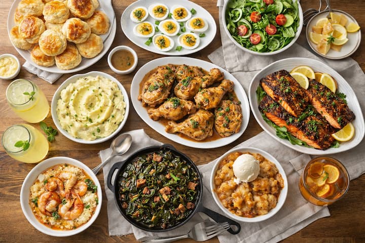 A multi-course dinner featuring elevated Southern classics such as herb-crusted chicken, blackened salmon, Cajun shrimp, creamy grits, seasonal vegetables, and indulgent desserts. Designed to impress.