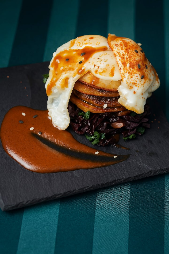 Enjoy a 3-course family-style brunch featuring a signature take on chicken and waffles with smothered peaches. The menu also includes suya shrimp with yellow grits and red pepper aioli, and a legume layer with tortillas and sweet plantains topped with quail eggs served sunny side up.