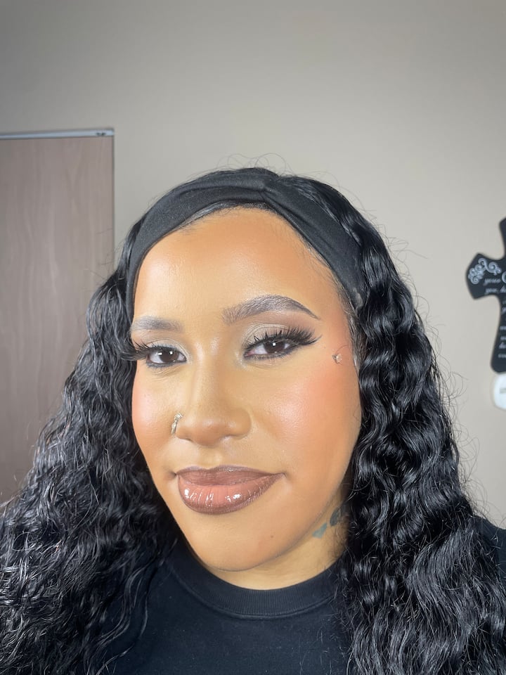 A seamless, camera-ready soft glam that enhances your natural beauty with luxe, velvety skin, softly sculpted cheek, and a flawless, radiant finish. Eyes are defined with a smokey gradient that stays soft and sultry paired with fluttery lashes for a lifted look. Brows are clean and structured, while the lips stay glossy and neutral for the effortless, feminine glow. Perfect for photoshoots, events, or anytime you want to feel polished and irresistible without looking overdone.