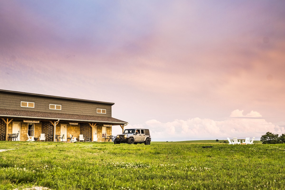 Enjoy our piece of country paradise! 1 BR lodge sleeps 4 comfortably w/fully equipped kitchen, W/D, fire pit & grill. Relax at our peaceful lodge after hunting at nearby Ravenwood Lodge or escape with the family. Spacious walk-in shower. Breakfast items & great coffee options provided! You may see pheasant, quail & deer on the property. Near Echo Cliff park & on the edge of the Flint Hills. No pet fees!! Low cleaning fees & no occupancy tax! Early check in/ late check out may be available.
