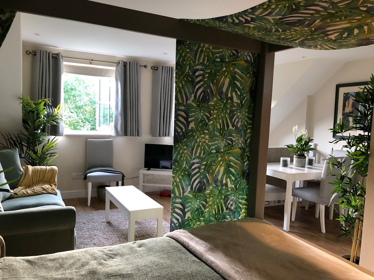 Relax in this calm, stylish space. The bright and airy living room has a vaulted ceiling and spacious lounge (including Sky TV) with separate Bedroom and Bathroom. There is a fridge and a small area for making tea / coffee and toast but no cooker - who wants to cook on holiday anyway!! There are local pubs including one within 3 mins walk serving good food, shops and even a Victorian cinema in walking distance and many other Sussex and Kent places of interest within a short drive.