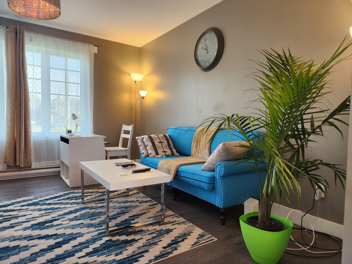This 2 bedroom apartment is located on the second floor with view of the city and ski hill. Walking distance to most attractions the city has to offer. The apartment has 7 major appliances, quality furniture, Starlink interne 300mbpsThe apartment is fully cleaned and disinfected between each Guests. One parking spot available , additional parking on the street, Storm proof with generator and power inverter Grand 4 1/2, bien situé, très bien équipé et désinfecté, parfait télétravail Très secure.