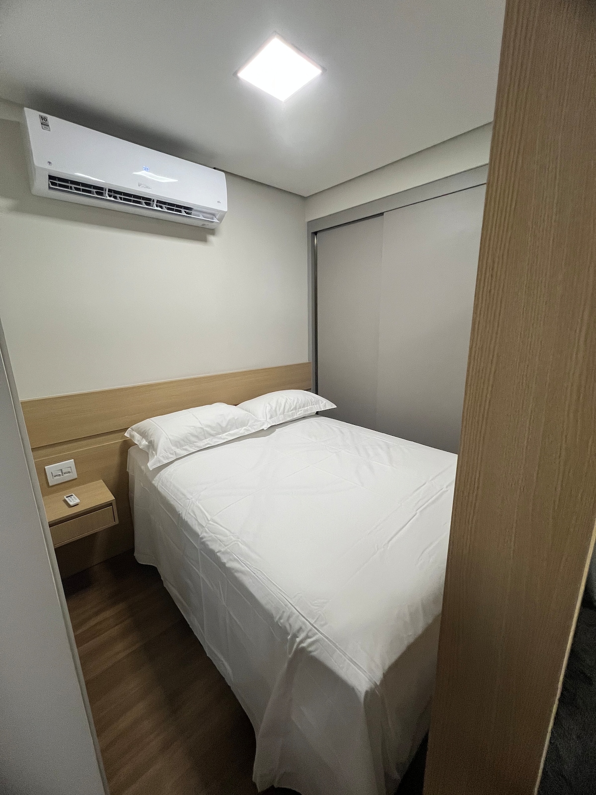 O ambiente é compacto, funcional e conta com tudo o que você precisa para uma estadia agradável, seja a trabalho ou lazer. • Quarto aconchegante com cama de casal, ar-condicionado e roupa de cama limpa • Sala integrada com sofá, mesa de trabalho/refeições e TV • Cozinha completa com fogão de indução, micro-ondas, geladeira e utensílios básicos • Banheiro moderno com box de vidro, espelho e chuveiro elétrico • 1 vaga de garagem inclusa