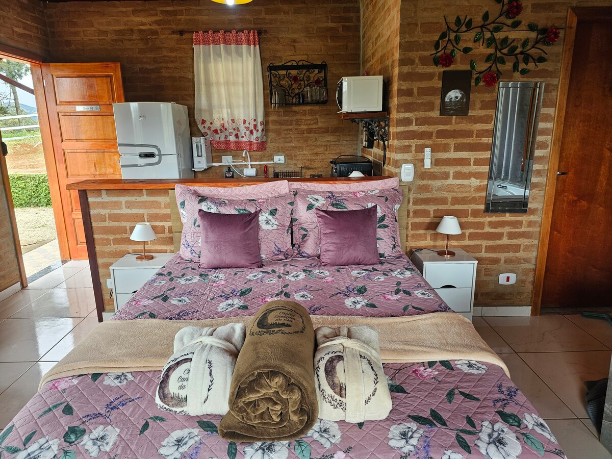 🌈 ❤️Welcome RECANTO CONEXÕES Cabana Paz Enjoy a weekend for two with privacy, refinement and quiet Quiet place, surrounded by nature, stunning view. A carefully planned environment for those seeking coziness. Come and enjoy this space surrounded by mountains and tranquility. The Chalé Paz is an elegant space with a cozy design. Enjoy a beautiful sunset while drinking wine! By the fireplace or campfire. Double hydro with a breathtaking view