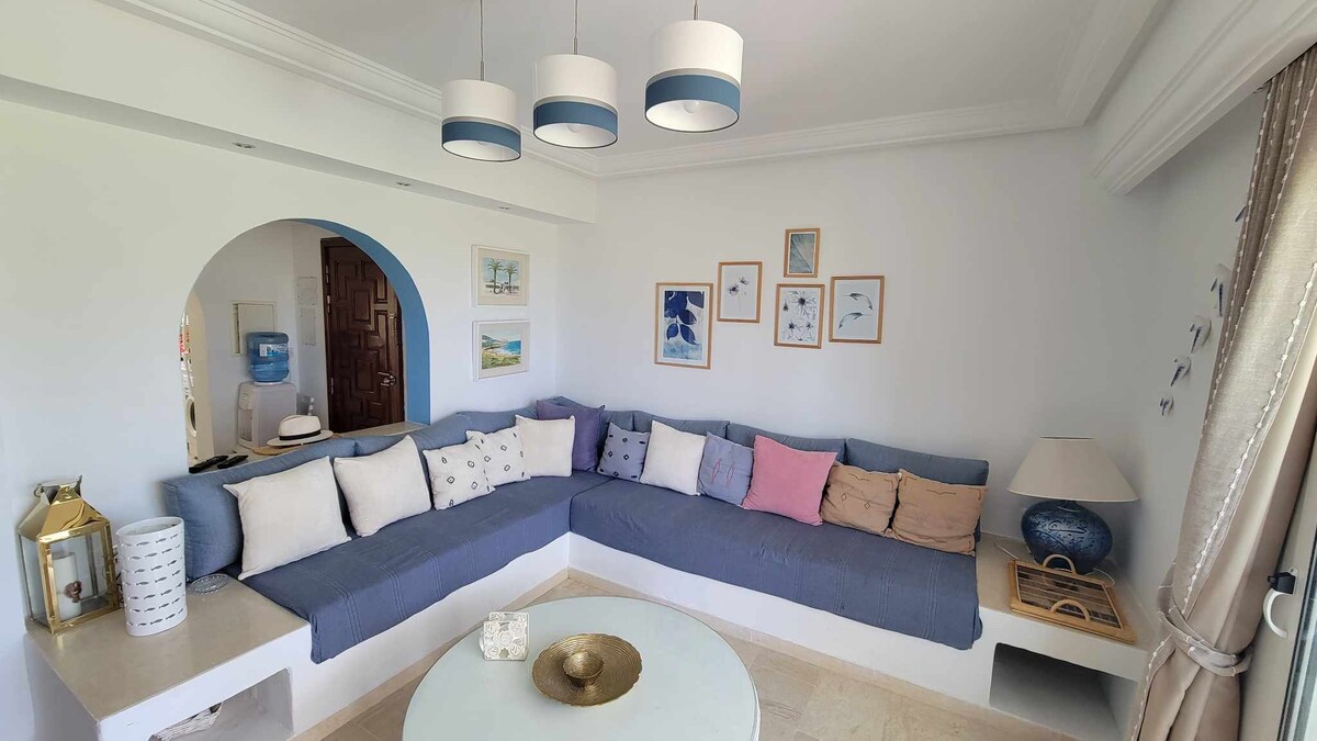 An ocean view Apartment , centrally-located place. Walking distance from downtown, old Madina , Corniche bizerte , private beach, pool , Day and night entertainment, 4 star restaurant, and coffee shop , night time life band , kids and family friendly , and the most important highly secure and safe. You will stay in private apartment that can fit up to 5 people, 1 Room with Double bad and a living Room with 3 BiG sofa bad each Room has a private AC control Spacious, , AC , Free WIFI,….