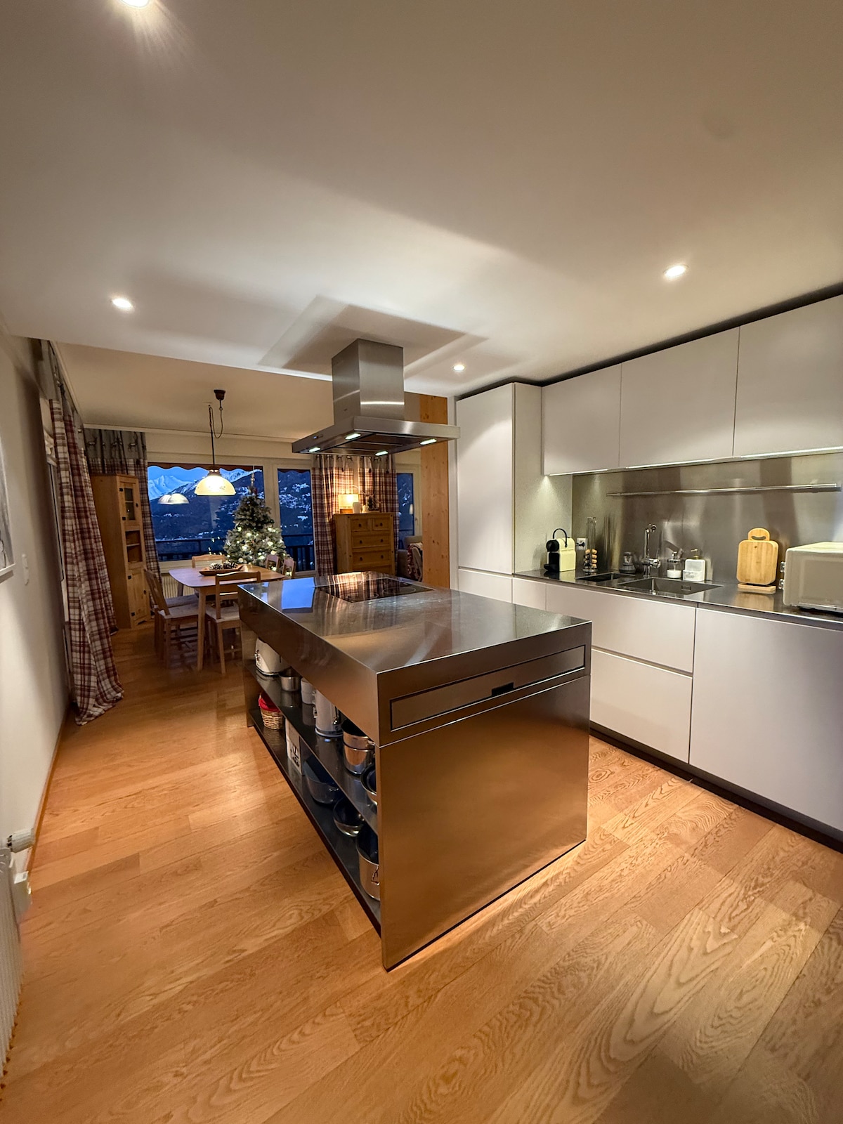 Bright 3-room apartment in a small chalet of 3 dwellings at 5 minutes walking distance from the funicular and the village centre. Drop off your car at your arrival on the included parking spot, no need anymore. You have a breathtaking view of the peaks of the Val d'Anniviers from the terrace. Ideal for 4 people, possible up to 6 (2 extra beds for children). Kitchen, windows and heating completely renovated for optimal confort.
