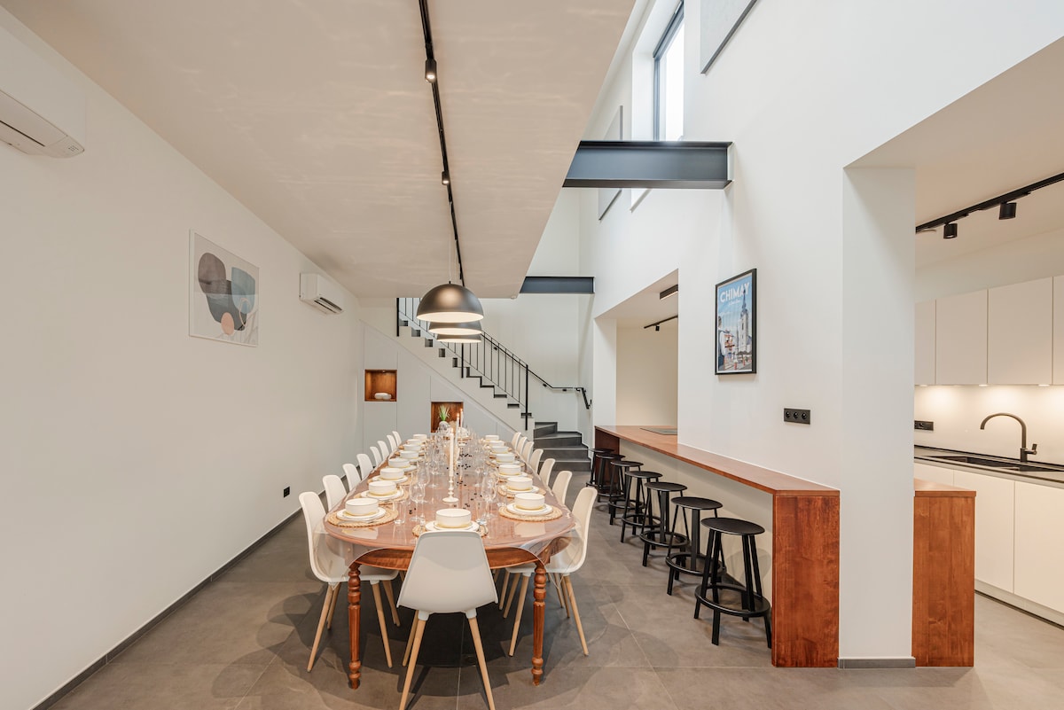 Ancien couvent au centre de Chimay, juste rénové avec extension contemporaine. Au pied du château de Chimay/Grand Place à 200m. Gîte au coeur de la ville, jardin privé le long du cours d'eau "l'Eau Blanche" et de jardins en terrasse avec vue sur le vieux Chimay. Idéal pour des vacances en famille ou entre amis. A proximité: étangs de Virelles, barrages de l'Eau d'Heure, site Natura 2000, circuit de Chimay, Abbayes de Scourmont Refus fêtes /retrouvailles étudiants. Insta: chapelle1607