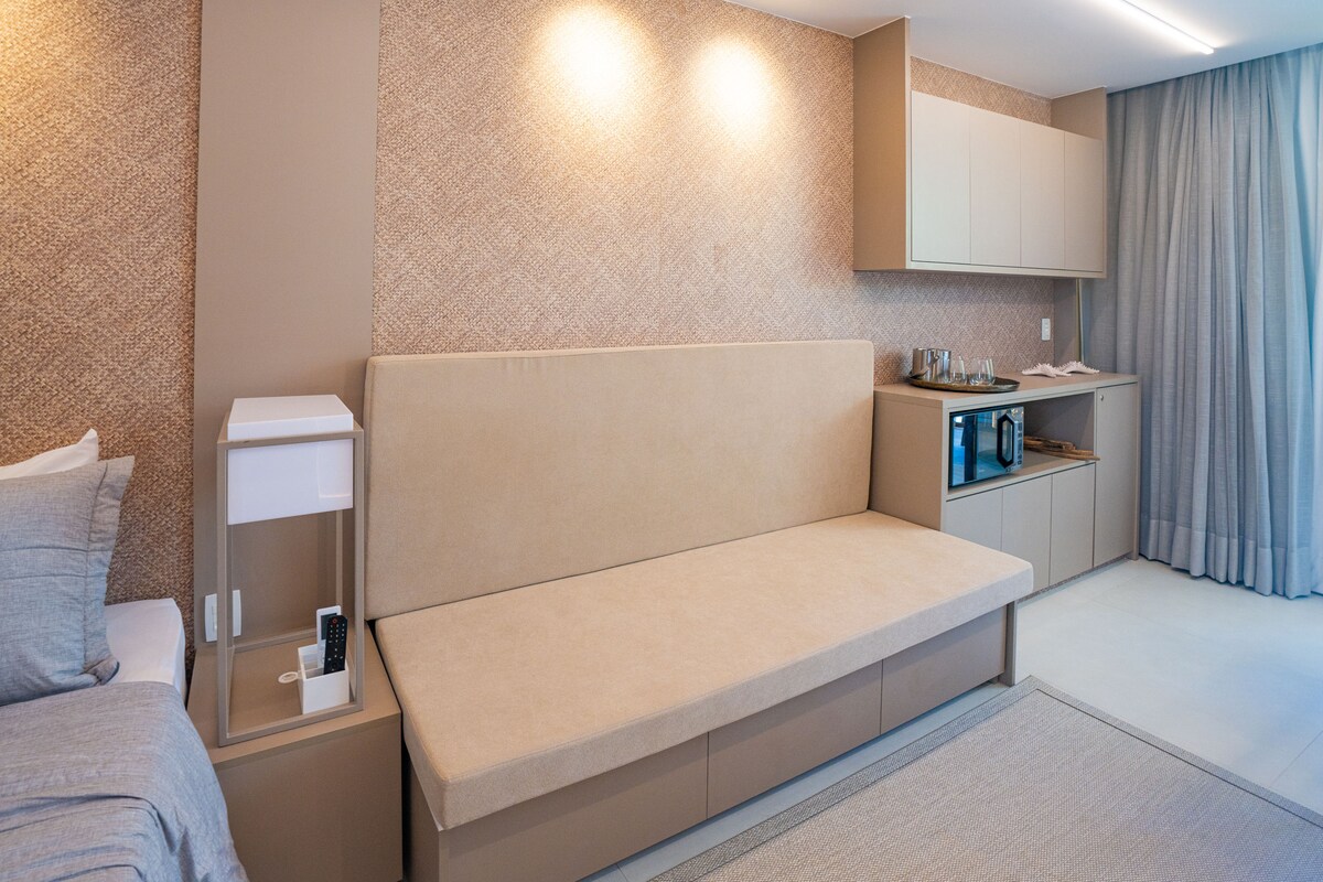 AMURA FLAT - Beira mar da Praia dos Carneiros. Eleita por várias vezes como a melhor praia do Brasil. Excelente trecho c/ águas cristalinas e quentes localizada em Tamandaré/PE. Empreendimento novo. O FLAT Flat família c/ 01 cama Queen + 01 sofá cama c/ capacidade p/ até 04 pessoas c/ varanda gourmet. Possui: ar, secador, grill p/ churrasco, cooktop 02 bocas, liquidificador, sanduicheira, cafeteira, micro-ondas, cuscuzeira e, enxoval. Tem piscina, quadra futebol, Beach Club / parque.