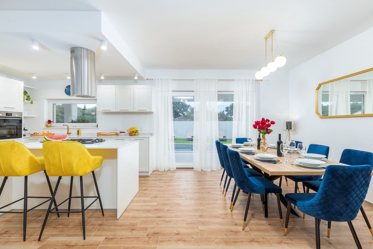 The villa is a modern and new villa in a quiet and private location, but not far from the sea 8km. and the city of Pula 7km away The large, private, heated swimming pool with a waterfall and a swim-up pool bar is pure luxury.Extra cost for heated pool 300 euros per week. On the covered dining terrace you can grill your specialties which you can prepare in the summer kitchen on the grill.