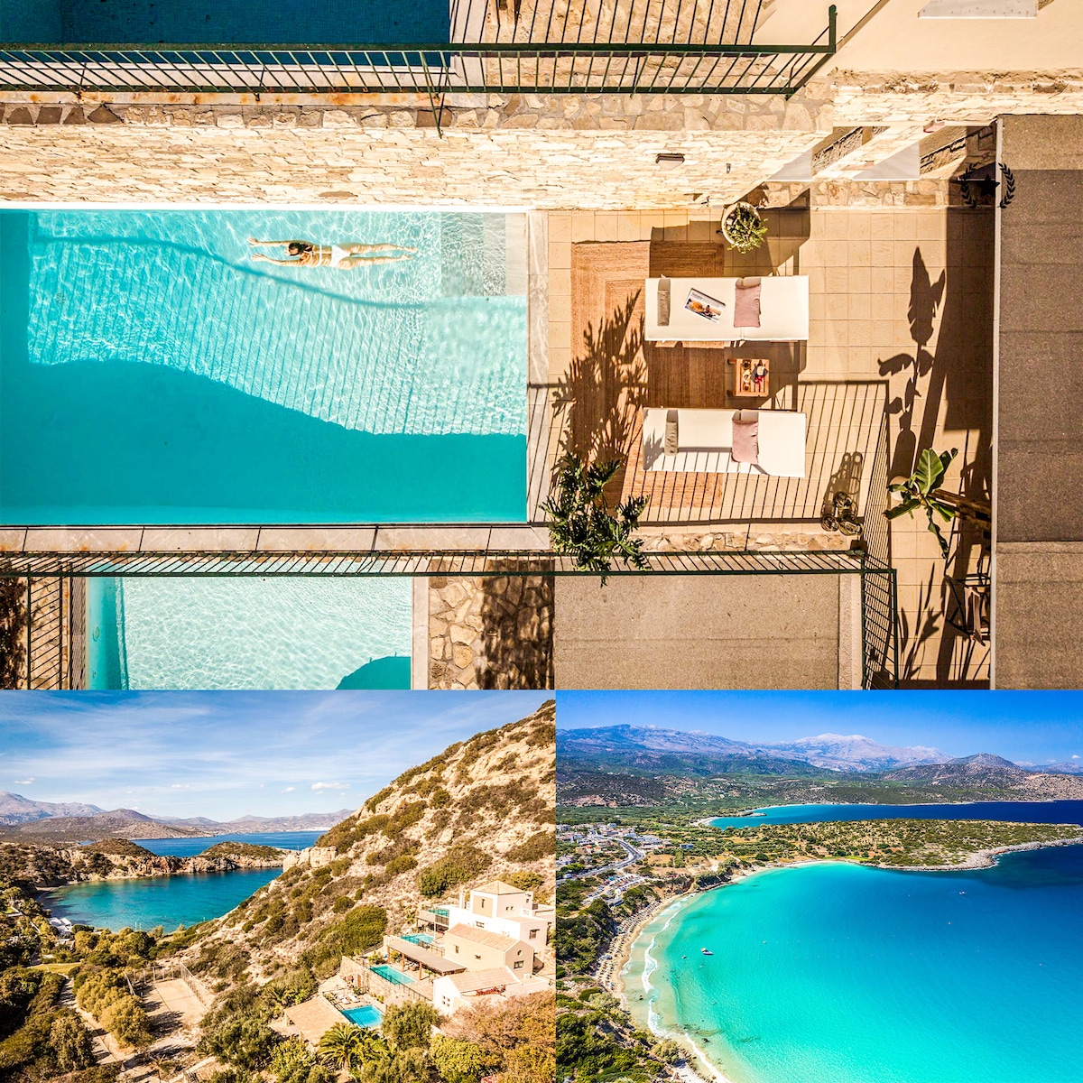 Απολαύστε γαλήνιες διακοπές στη θάλασσα! Ξυπνήστε το πρωί βλέποντας από το κρεβάτι σας μια μοναδική ανατολή ηλίου. Χαλαρώστε στο υπαίθριο τζακούζι, στην κοινόχρηστη πισίνα, τις βεράντες, ακούγοντας τον ήχο των κυμάτων και το κελάηδισμα των πουλιών. Η θέα παντού είναι εξαίσια. Μπροστά σας το απέραντο γαλάζιο του Κρητικού Πελάγους, γύρω σας η εντυπωσιακή κρητική φύση. Από τα δύο σαλόνια ως τις κρεβατοκάμαρες, την τραπεζαρία, την κουζίνα, τα μπάνια, το υπαίθριο ντους, η θέα είναι συναρπαστική.