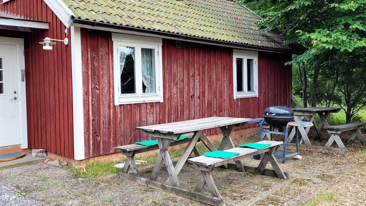 Cottage on a garden plot close to nice swimming areas and excellent hiking trails. Five beds, two of which are in the living room. The kitchen is equipped with two hotplates, microwave and air fryer as well as a refrigerator (no dishwasher or oven). The shower is outdoors.