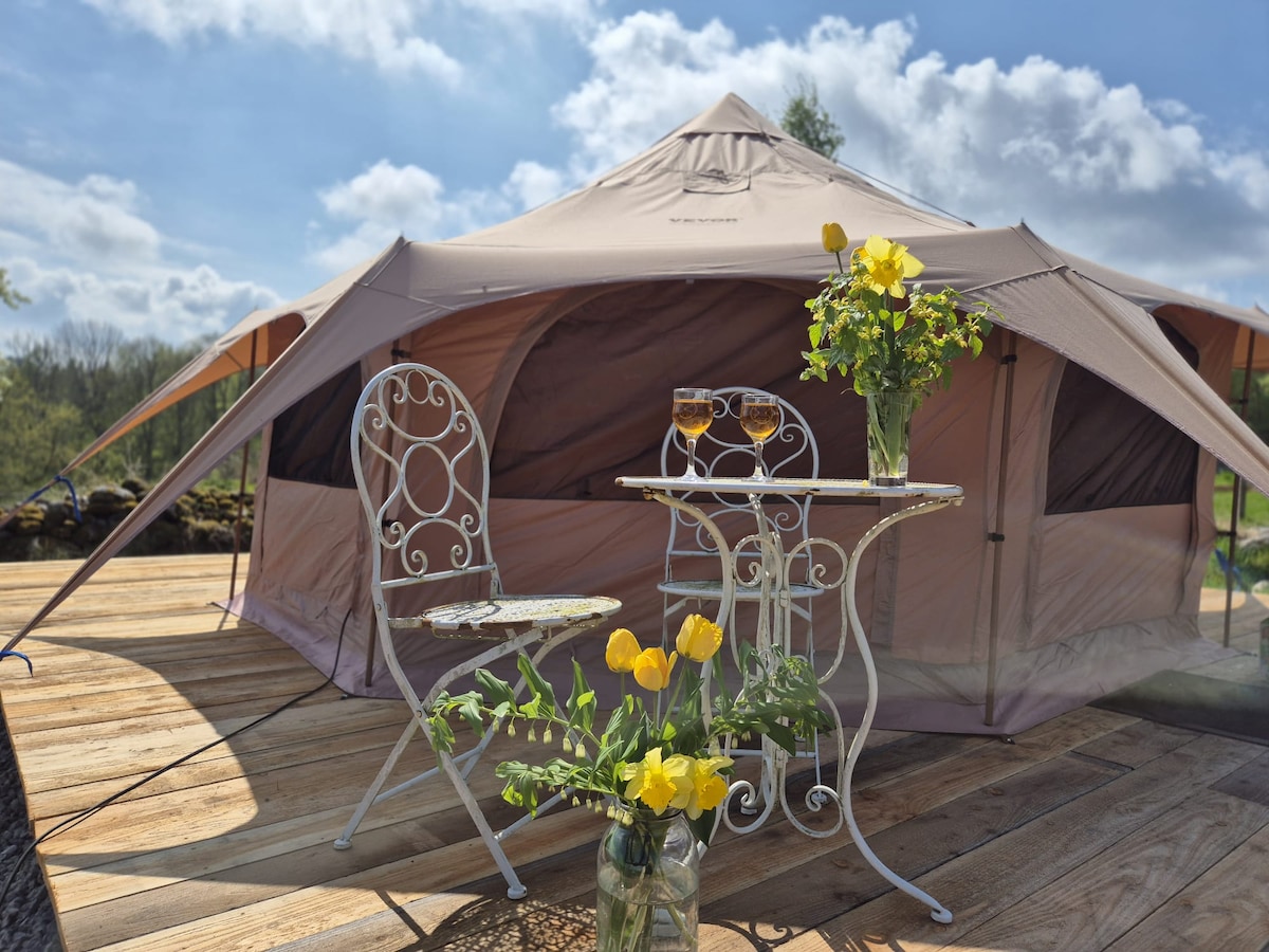 Här bor du helt ostört med en vacker vy framför dig och skogen bakom dig. Ni sover skönt i en 160 cm bred säng Här finns mulltoa och färskt vatten på dunk. Grillmöjligheter och eldstad för öppen eld. Grillbricketter och ved ingår. Glampingen ligger i Fastarp i Klippans kommun utmed cykelleden 102 skåne. Parkering finns på gården ca 300 meter från platsen. Eller kan man parkera på ängen intill glampingen. Finns möjlighet att ha häst i en tillfällig hage intill tältet
