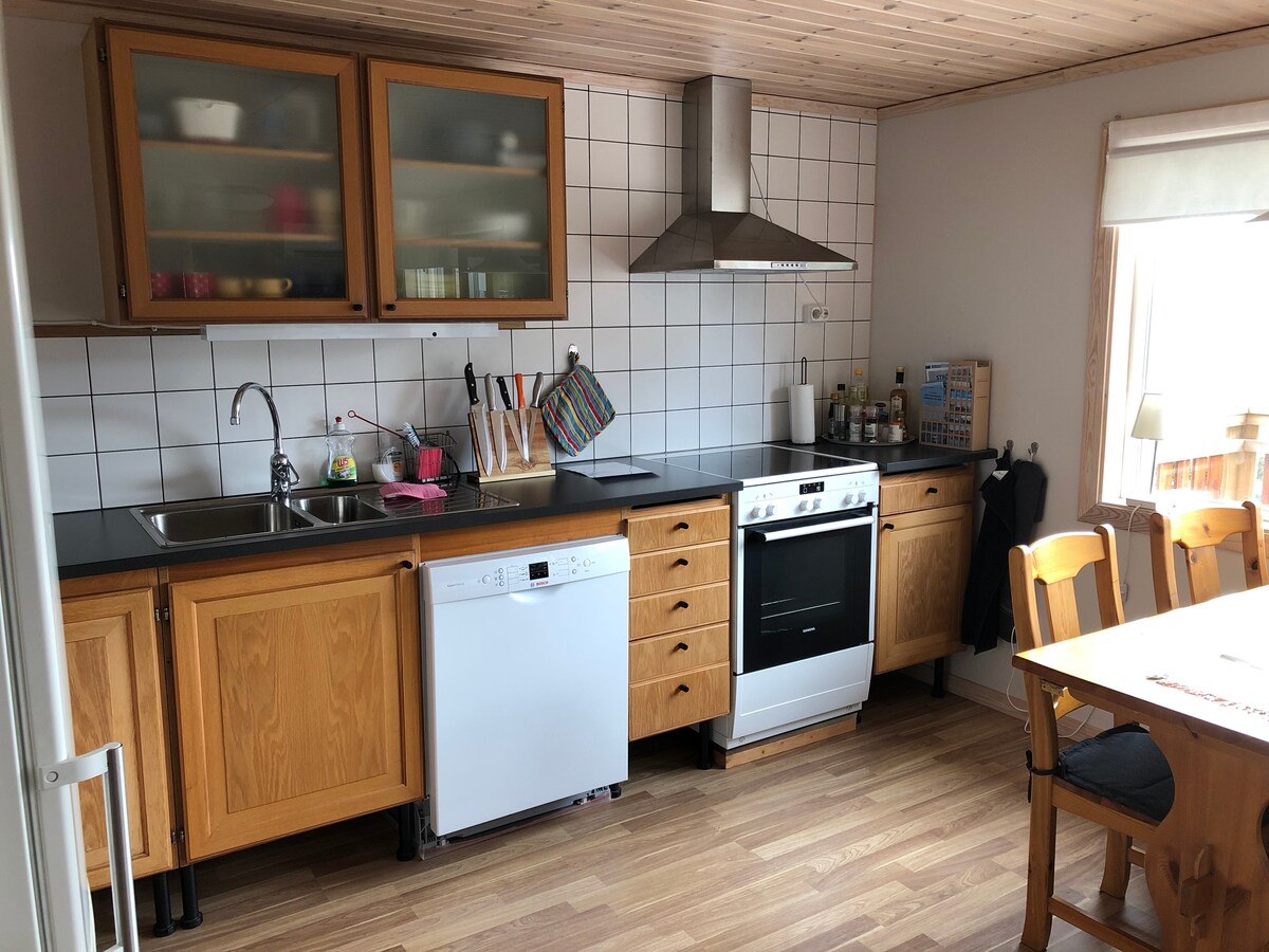 Kök och allrum med 155 cm dagsäng och havsutsikt. Stort sovrum med 160 cm dubbelsäng. Kök med ugn/induksjonshäll, kyl/frys, disk och micro. Bad med dusch, tvättmaskin och torktumlare. Altan och stor uteplats med gräs. Parkering utanför. 10 minuters gånge til vattnet med stränder, klippor och båthamn, skogen 1 minut bakom huset. 15 min att köra til centrum, 10 minuter til Nordby shopping. 20 minuter till Koster med båt. Lugnt område.