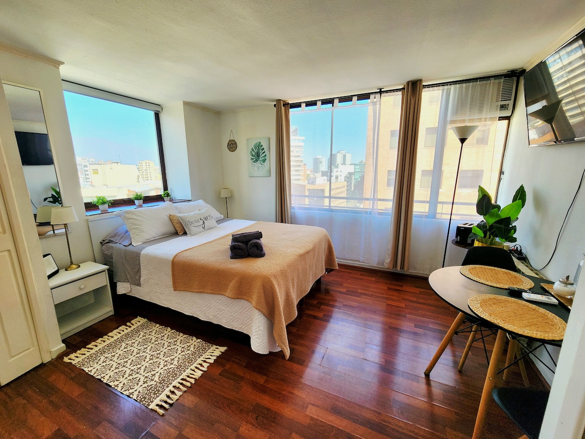 Studio, modern design, ThermoPanel for acoustic and thermal insulation, A/C. Located in the top-rated area in Santiago. Steps away from Tobalaba Metro station, from best restaurants in Santiago, from Costanera Center Mall, cafes and a supermarket. Excellent wifi, free of gas appliances, Cable TV, Smart TV 55" curved screen, nice bathroom. All in a safe neighborhood with many services. For security reasons, it is required to send us, after booking, photos of ID and selfie of each guest.