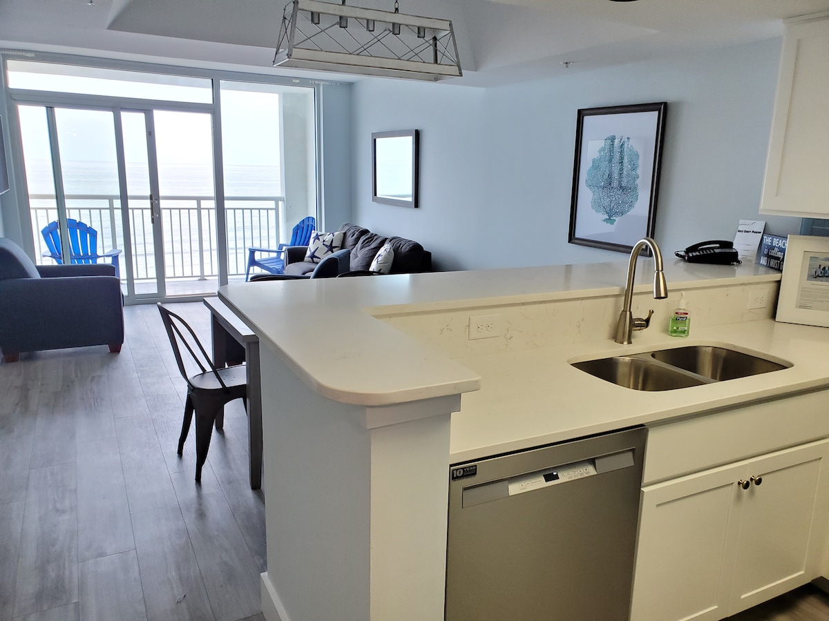 Treat yourself to a relaxing and rejuvenating stay in this brand new, fully renovated oceanfront condo! Enjoy ALL NEW modern furnishings & finishes including beautiful Quartz countertops, shaker cabinets, stainless appliances, updated bathroom, & all new furniture. With this 9th floor, oceanfront, end unit, you'll enjoy stunning sunrises, pools & hot tubs, a large OF lawn with tons of seating. Super close to Starbucks, lots of restaurants, bars, Convention Center & boardwalk.