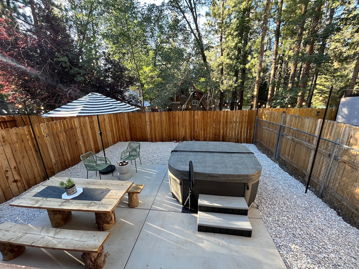 Enjoy this newly built, Bohemian styled cabin in the woods. Perfectly located in the desired Moonridge neighborhood less than a mile from Bear Mountain and Snow Summit Resorts. Walking distance to the Alpine Zoo, golf, biking/hiking trails & restaurants. The village and lake are just miles away. Enjoy private parking, a fully equipped gourmet kitchen, spacious bedrooms and 2 full bathrooms, smart TVs, high speed Wi-Fi, and a fenced in backyard complete with hot tub!