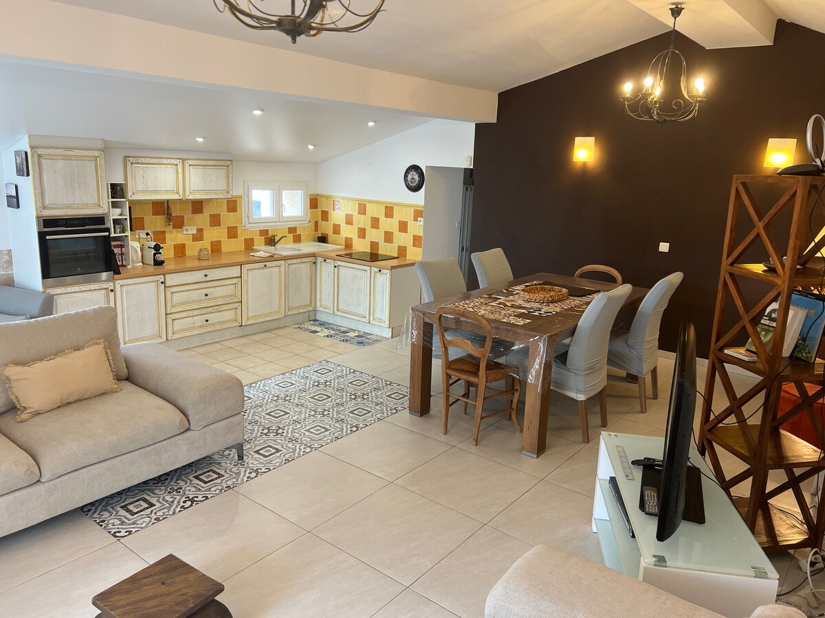 New F2-type accommodation, at the bottom of the villa with sea view. Equipped kitchen, bathroom with walk-in shower, bedroom with 160 bed, living room with sofa bed, utility room with washing machine, dryer and freezer. The apartment has a large terrace with barbecue and sea view. Close to all amenities, 150 m from the casino supermarket, and 2 minutes from the beaches and the city center.