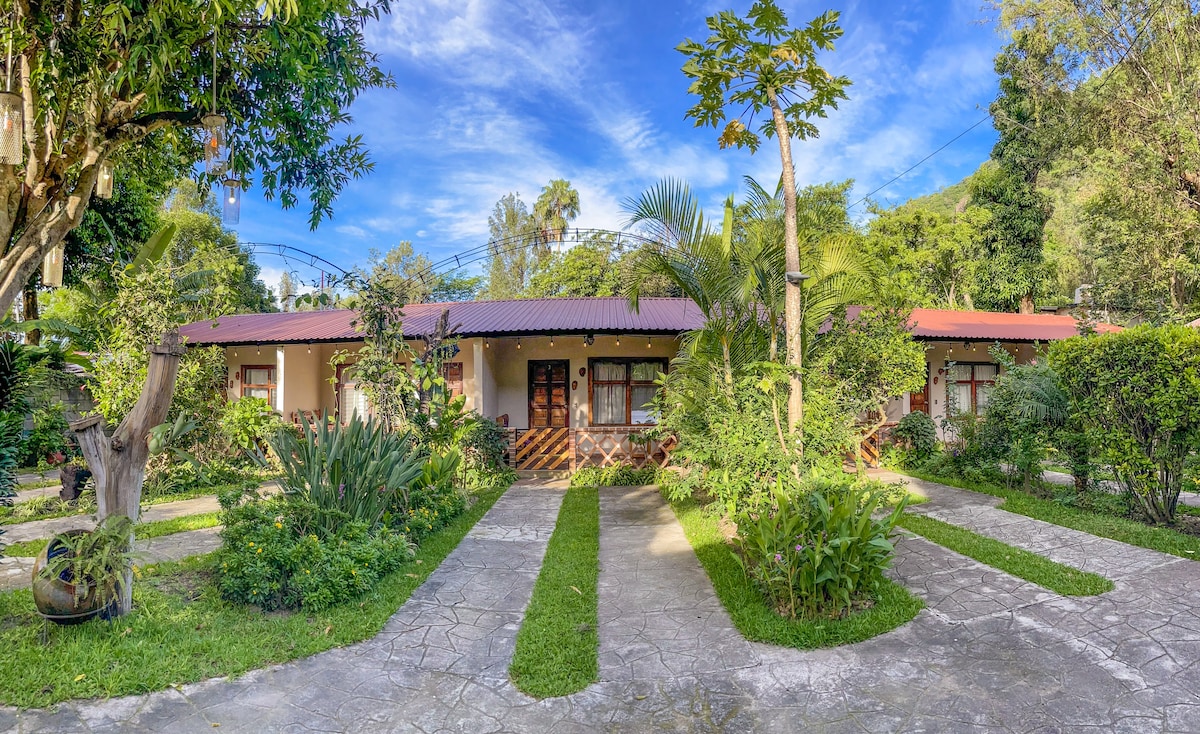 Our 6 rooms were built on an old coffee farm in the center of Panajachel. We are surrounded by peace, native trees, gardens, endemic birds, and pets. Our rooms' amenities are: a private bathroom with hot water, cable TV, Wi-Fi, parking, and a comfortable porch. The social areas have a communal kitchen and a pergola. Our central location puts you minutes away from supermarkets, restaurants, cafes, bars, and the most popular places.