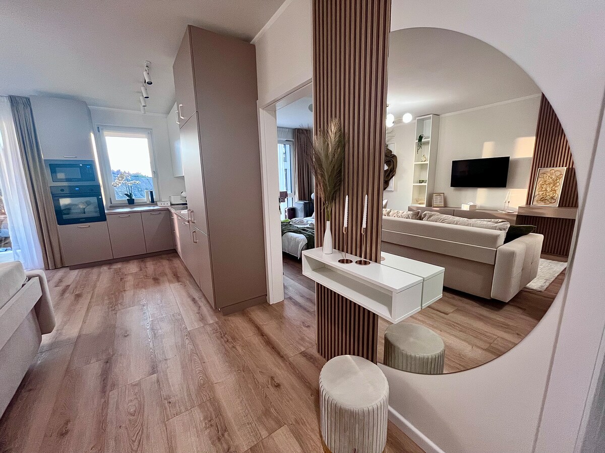 Cozy and relaxing apartament with a great view. The place has a minimalistic design and elegant details .It has all the appliances and devices that you expect in your home. With a 5 minute walk to the local shops and 10 minutes to the local bus station . We offer on site free parking. We also ofer air conditioning for a smal extra fee .