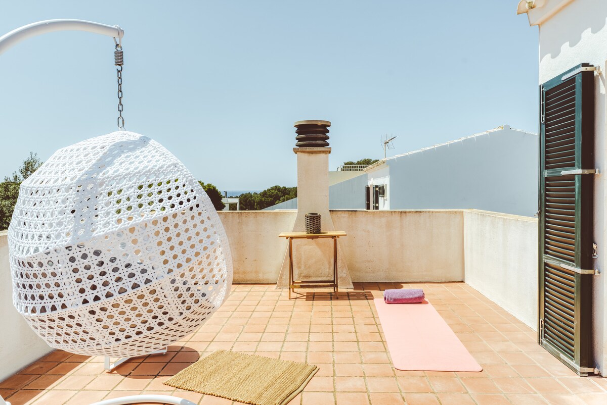 Warning! This house is exclusively on AIRBNB, Baléares Boheme and Un Viaje Unico. Beautiful modern architectural house, sea view, 5 minutes from Punta Prima beach, Sant Lluis town, 15 minutes from Mahon and the airport; HEATED POOL. FURNISHED ROOF TOP. 4 bedrooms, including a master suite, and 3 bathrooms. Entirely facing the sea and the countryside, it offers magnificent views from every room, and a lot of calm. Tourist license number ET 0399 ME