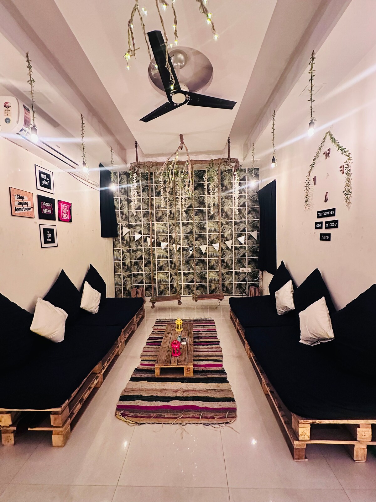 Boho-luxury 1BHK with a warm, cozy vibe featuring a private balcony with cushioned swing and fairy lights. ✨ Enjoy a 55” Smart TV with soundbar and subwoofer for a theatre-like experience. The stay offers AC, air purifier, induction, fridge, RO, cookware and tea/coffee. 🙌🏻 Located near Shalimar Bagh Metro, just 100m from KFC, Domino’s and McDonald’s, and close to PVR and Pacific Mall. 📍 Ideal for dates or birthdays, with décor available on request.❤️