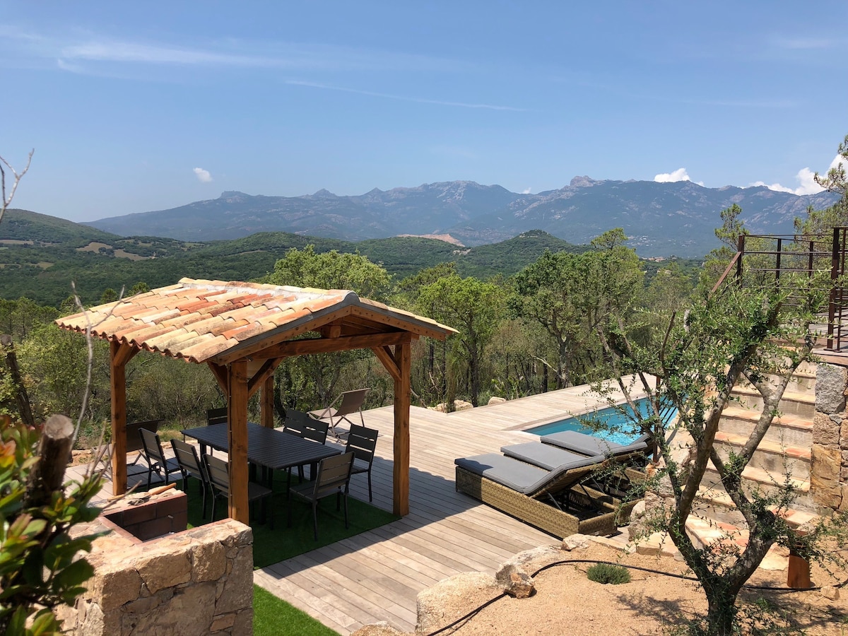 🌿 U Cantonu di l'Arti – Architect-designed villa with heated pool and mountain views located in Sotta 🌄 Nestled in a preserved natural setting, U Cantonu di l'Arti is an exceptional villa where modern architecture blends perfectly with the wild beauty of the Corsican landscape. Designed to blend in with the surrounding vegetation and rocks, this villa invites you to enjoy a refined stay, combining comfort, calm and breathtaking views. SWIMMING POOL CLOSED FROM DECEMBER 1 TO APRIL 1