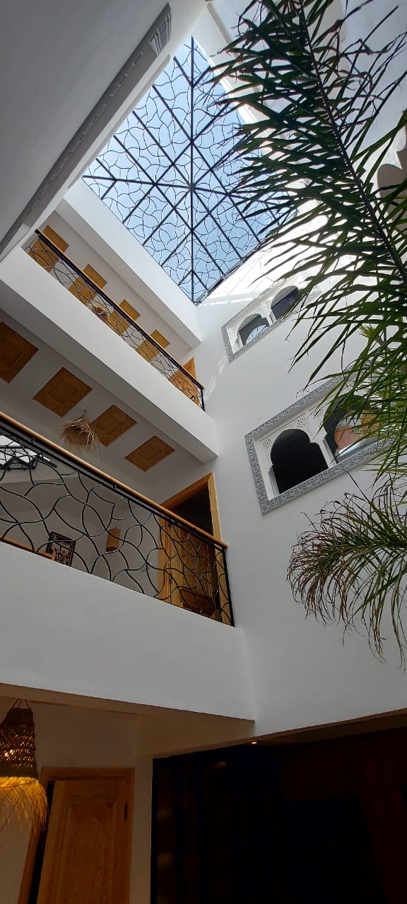 Agadir Talborjt Ce superbe Riad, en centre ville,à 10mn de marche de la plage,vous accueille dans un style marocain épuré et moderne Cette propriété,entièrement rénovée,offre une conception haut de gamme, unique sur Agadir! Vous entrez dans un jardin d’où monte un puit de lumière jusqu’aux 2 étages et la terrasse,dans la pure tradition des Riads Marocains Le jardin intérieur est un salon de repos avec télévision câblée et Netflix avec sofas,fauteuils et poufs marocain.Un vrai salon détente.