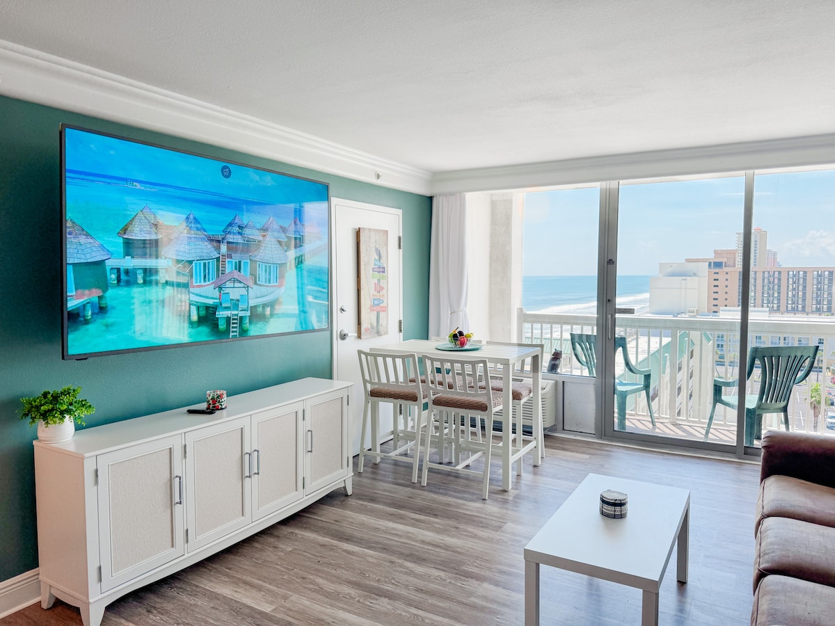 Incredible 9th floor one bedroom condo at the Daytona Beach Resort with a full private balcony. Easily sleep 6 in this modern and fresh unit. During your stay Enjoy 2 giant tv's, luxury beds, views for miles and a central location close to shopping and resturants! The bed sizes are a King, Full, and a Queen size pull out. Please be aware that the resort’s parking garage and on-site restaurant are currently closed for maintenance