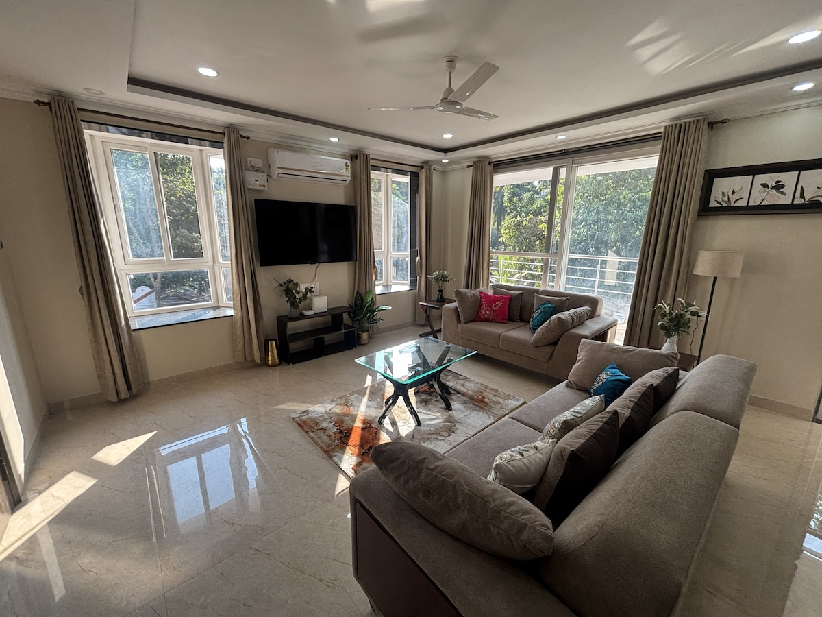 Modern Boho Apartment | Minutes from North Goa's Beaches.A cozy, fully furnished 1BHK retreat on ground floor perfect for couples, friends, or small families. Highlights: - Stylish Boho Interiors with a warm vibe - AC in bedroom & living room for comfort - Smart TV + High-speed WiFi - Equipped kitchen with RO water, cooktop, fridge & washing machine - Shared swimming pool (9 AM–6 PM | swimwear mandatory - On-site gym available at INR 200/-per person per day - 24/7 security - Free Parking
