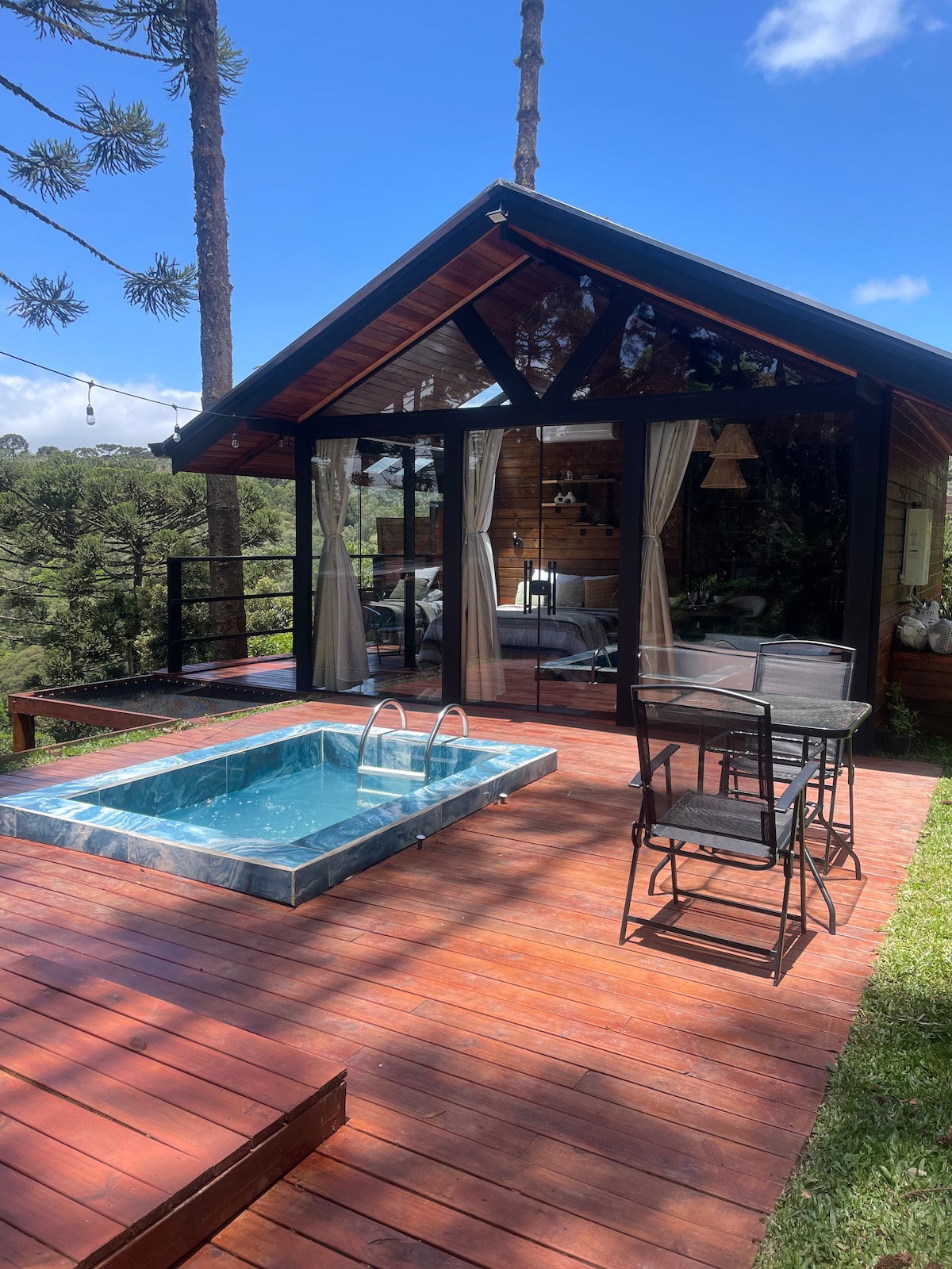High-end cabin located in the rural area of São José dos Pinhais in a secure property, surrounded by incredible nature. * Includes a breakfast basket proportional to the number of daily rates, basket available on arrival. * Relax in our indoor whirlpool. * Fireplace * Air conditioning * Fire pit * Fully equipped kitchen (Refrigerator, sandwich maker, cooktop, oven, microwave, coffee maker, pots and utensils). * Smart TV. * Internet. * Gas heating. * Place for 2 people (+18)