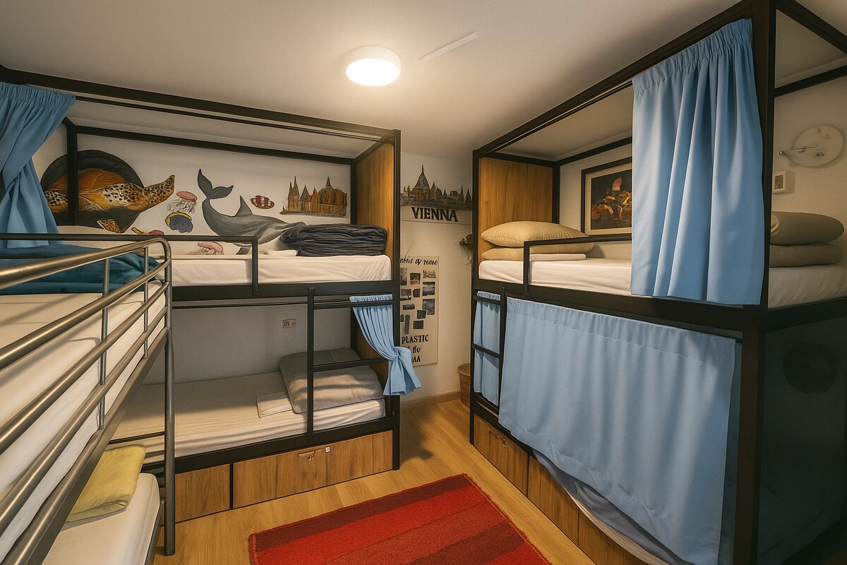 Bed in a large bedroom with natural light. 2-meter-long bunk beds. Each bed has its own light, plug, USB socket, and shelf. Each bunk bed has a "blackout" style curtain for greater privacy, as well as a large individual drawer under the bed that can be locked with a padlock. (Can be rented at reception). They have: Air conditioning Heating High-speed Wi-Fi Shared bathrooms and showers in the hallway Blankets Bed sheet Towels (extra with surcharge and upon request) Coat hanger
